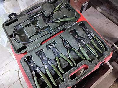 Разъеденем патрубки, вот такими штукенциями (очень крутая вещь, прям не заменимая при каждом ремонте). Подключаем аппарат.