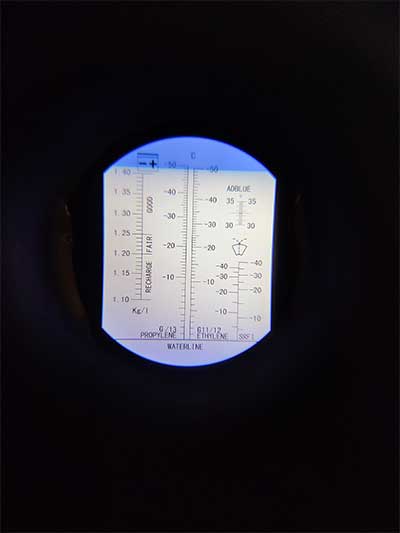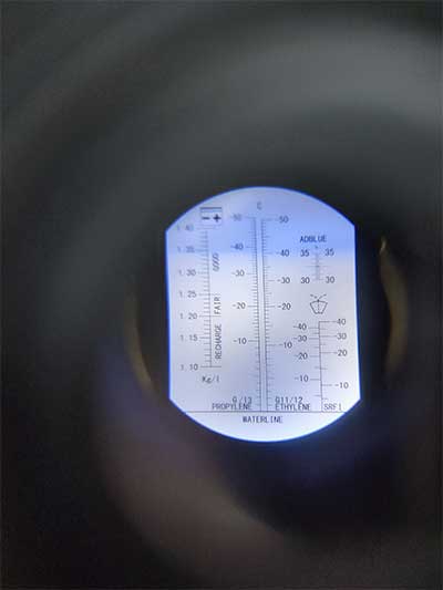 Капаем капельку на рефрактометр и видим температуру замерзания охлаждающей жидкости.